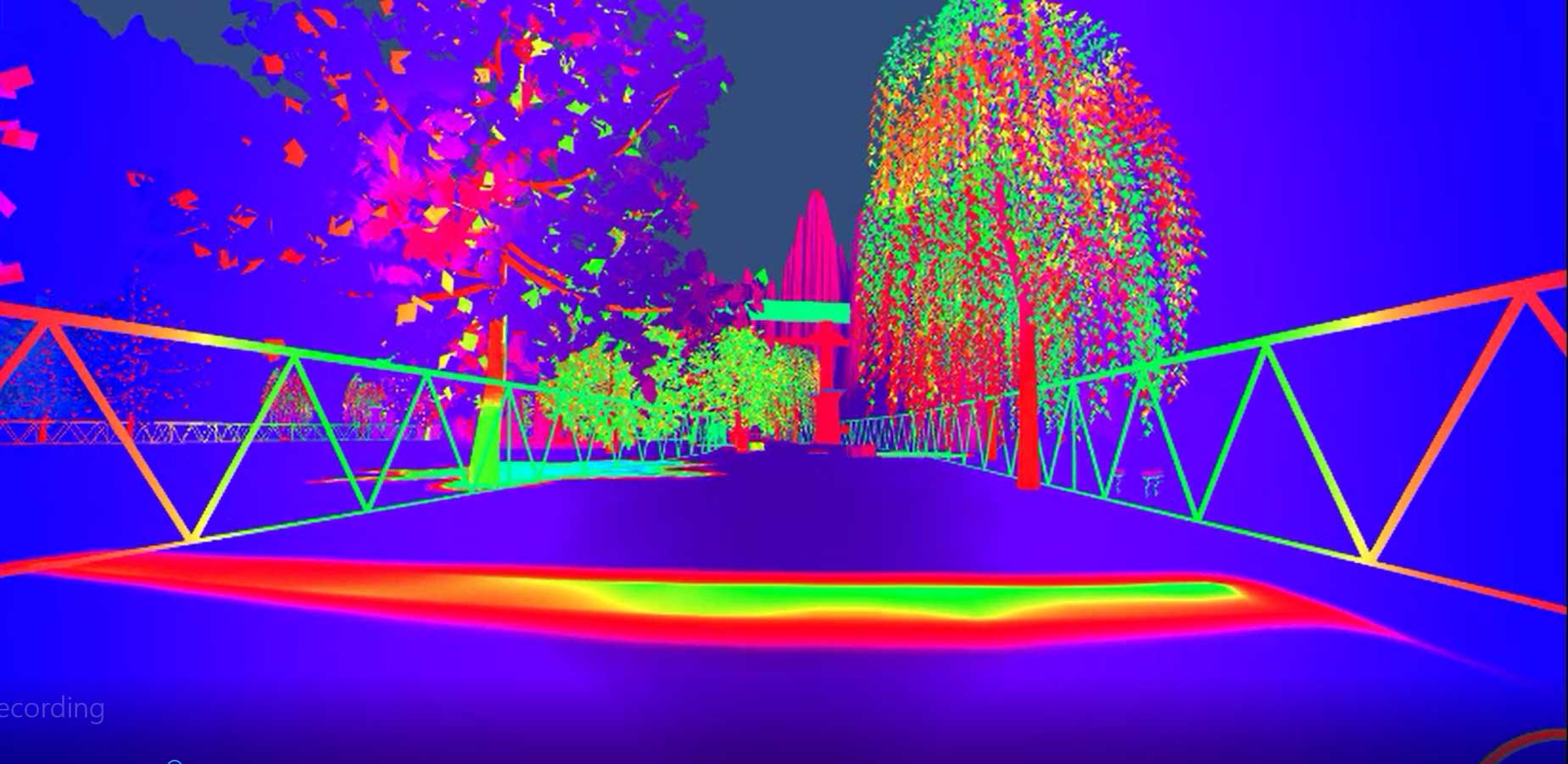 Captures d’écran du jeu finalisé. Ici, on peut voir les déformations de formes et de couleurs lors du déplacement du joueur à la vitesse de lumière.